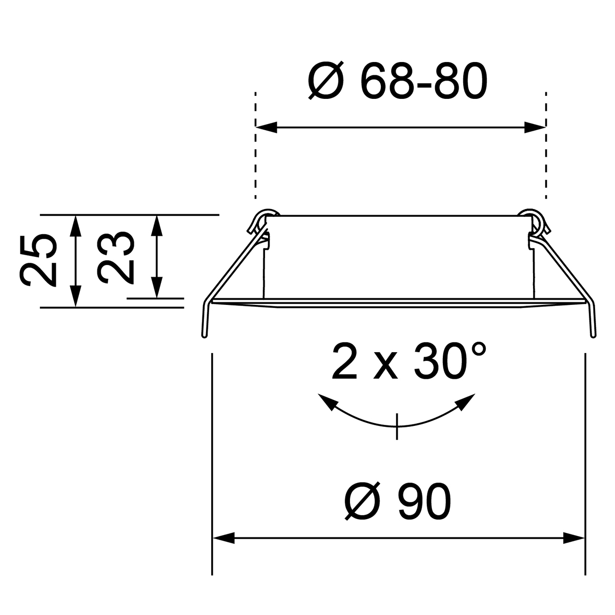 Produktgruppe: Deckeneinbauring, Swing 80, Ausführung: Bohrloch-Ø 68 – 80 mm, Sonderhinweis: mit Spannfedern, Ausrichtbarkeit: schwenkbar, Schwenkbar: 2 x 30°, Farbe/Finish: weiss, strukturiert, RAL-Farbe: 9003, Bemessungsleistung: max. 13 W (LED), Material: Aluminium, Durchmesser: 90 mm, Bohrloch-Ø (min): 68 mm, Bohrloch-Ø (max): 80 mm, Höhe: 25 mm, Einbautiefe 1: 23 mm