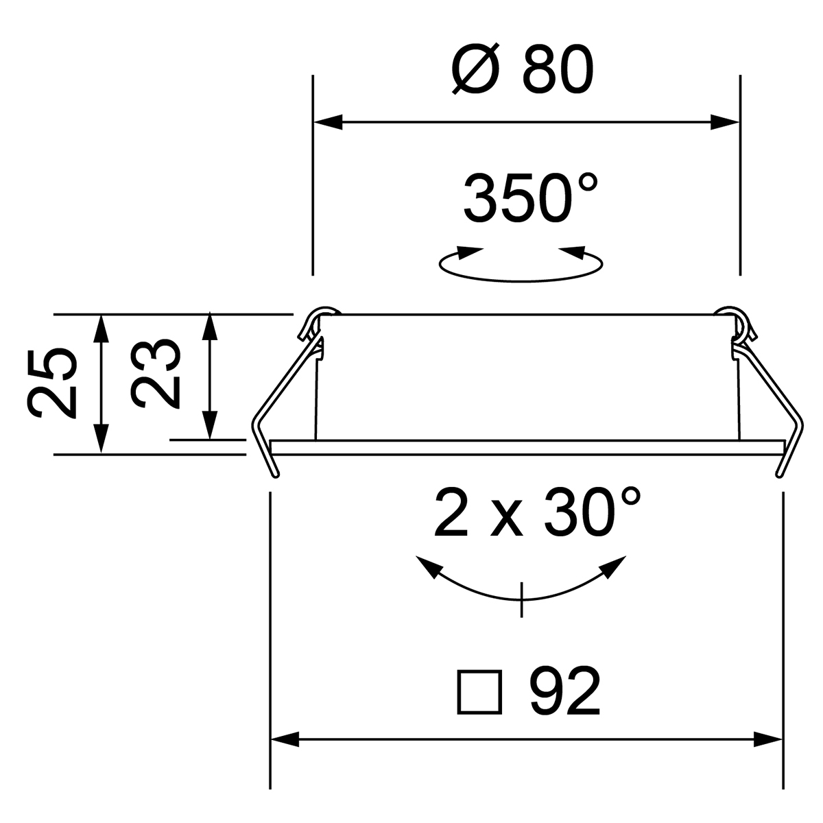 Produktgruppe: Deckeneinbauring, Twist 80 Square Plan, Ausführung: Bohrloch-Ø 80 mm, Sonderhinweis: mit Spannfedern, Ausrichtbarkeit: dreh- und schwenkbar, Schwenkbar: 2 x 30°, Drehbar: 350°, Farbe/Finish: weiss, strukturiert, RAL-Farbe: 9003, Bemessungsleistung: max. 13 W (LED), Material: Aluminium, Bohrloch-Ø (max): 80 mm, Länge: 92 mm, Breite: 92 mm, Höhe: 25 mm