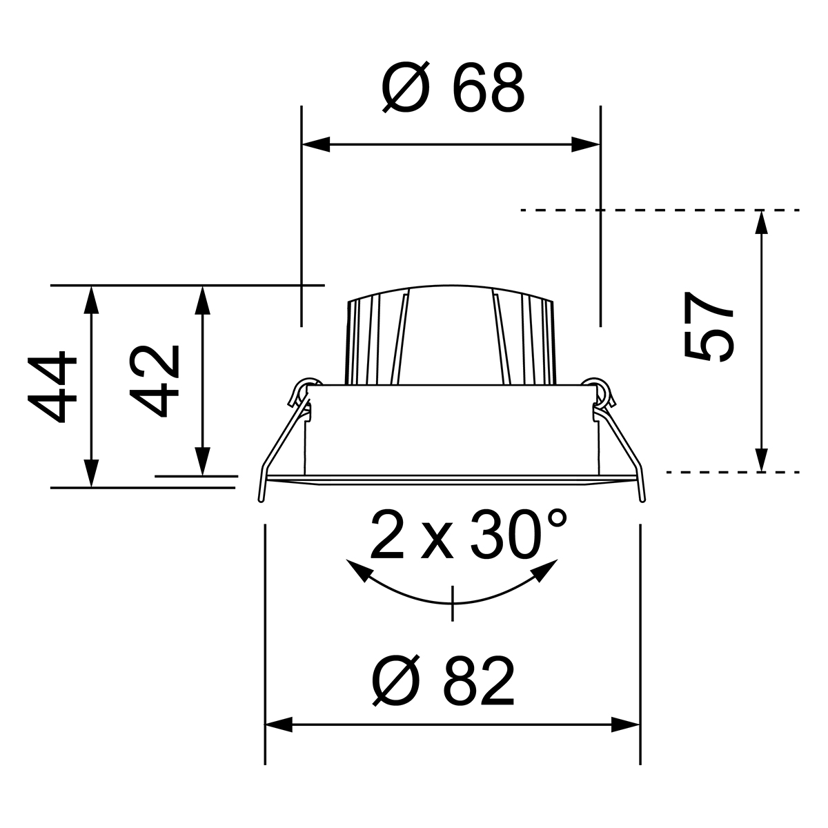 Produktgruppe: Einbau-Downlight, Swing 68, Sonderhinweis: mit Spannfedern, Ausrichtbarkeit: schwenkbar, Schwenkbar: 2 x 30°, Farbe/Finish: weiss, strukturiert, RAL-Farbe: 9003, Treiber: inkl. Treiber, Lichtsteuerung: Phasenabschnitt, Dimmbereich: >1%, Dimmtechnik: AM, Flickering: Flicker-free, Pst: < 1, SVM: < 0.4, Lichtstrom: 590 lm, Systemleistung: 5 W, Lichtausbeute: 118 lm/W, Farbtemperatur: 2700 K warmweiss, CRI: 90, Farbkonsistenz SDCM: 3, Abstrahlwinkel: 20 °, Anzahl Lichtquellen: 1, Anteil Direktlicht: 100 %, Energieeffizienzklasse: D, Lebensdauer LED: 50ʼ000h L80 B10, Schutzklasse: 2, IP-Schutzklasse: IP20, Material: Aluminium, Spannung PRI: 220-240 V, Frequenz PRI: 0/50/60 Hz, DC-tauglich (0 Hz): Ja, DC Spannungsbereich PRI: 176-280 V dc, Bestromung SEC: 120 mA, Vorwärtsspannung (min): 30 V, Vorwärtsspannung (max): 36 V, Einschaltstromspitze: 5A/300us, Durchmesser: 82 mm, Bohrloch-Ø (max): 68 mm, Höhe: 44 mm, Einbautiefe 1: 42 mm, Einbautiefe 2: 57 mm
