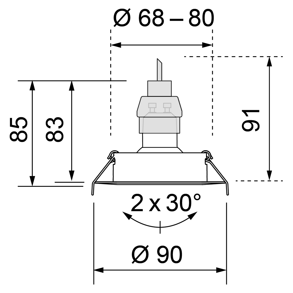 Produktgruppe: Einbau-Downlight, Swing 80 GU10, Sonderhinweis: mit Spannfedern, Ausrichtbarkeit: schwenkbar, Schwenkbar: 2 x 30°, Farbe/Finish: weiss, strukturiert, RAL-Farbe: 9003, Treiber: inkl. Treiber, Lichtsteuerung: Phasenabschnitt, Pst: < 1, SVM: < 0.4, Lichtstrom: 450 lm, Fassung: GU10, inklusive Leuchtmittel, Systemleistung: 6 W, Lichtausbeute: 75 lm/W, Farbtemperatur: 2700 K warmweiss, CRI: 90, Farbkonsistenz SDCM: 6, Abstrahlwinkel: 38 °, Anzahl Lichtquellen: 1, Anteil Direktlicht: 100 %, Energieeffizienzklasse: F, Lebensdauer LED: 25'000h L70, Schutzklasse: 2, IP-Schutzklasse: IP20, Material: Aluminium, Spannung PRI: 220-240 V, Frequenz PRI: 50/60 Hz, Durchmesser: 90 mm, Bohrloch-Ø (min): 68 mm, Bohrloch-Ø (max): 80 mm, Höhe: 85 mm, Einbautiefe 1: 83 mm, Einbautiefe 2: 91 mm