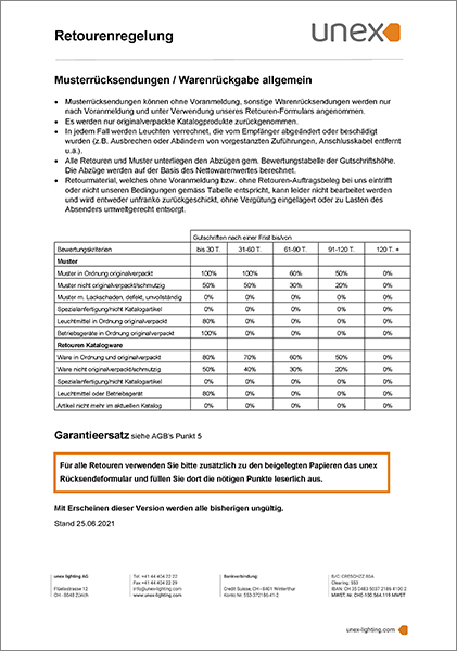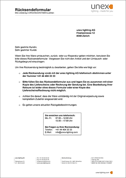 Wir nehmen nur einwandfreie Katalogprodukte im Originalzustand zurück, die weder durch Sie gebraucht oder beschädigt wurden. Artikel müssen in der Originalverpackung zurückgesendet werden. Konfektionierte Artikel wie beispielsweise LED-Lichtleisten auf Mass können leider nicht retourniert werden. Damit Ihre Rücksendung verarbeitet werden kann, bitten wir Sie höflich, das unten aufgeführte Rücksendeformular auszufüllen. Bitte achten Sie darauf, eine Kopie des Lieferscheins oder der Rechnung beizulegen, damit wir Ihre Rücksendung problemlos zu der jeweiligen Bestellung zuordnen können.