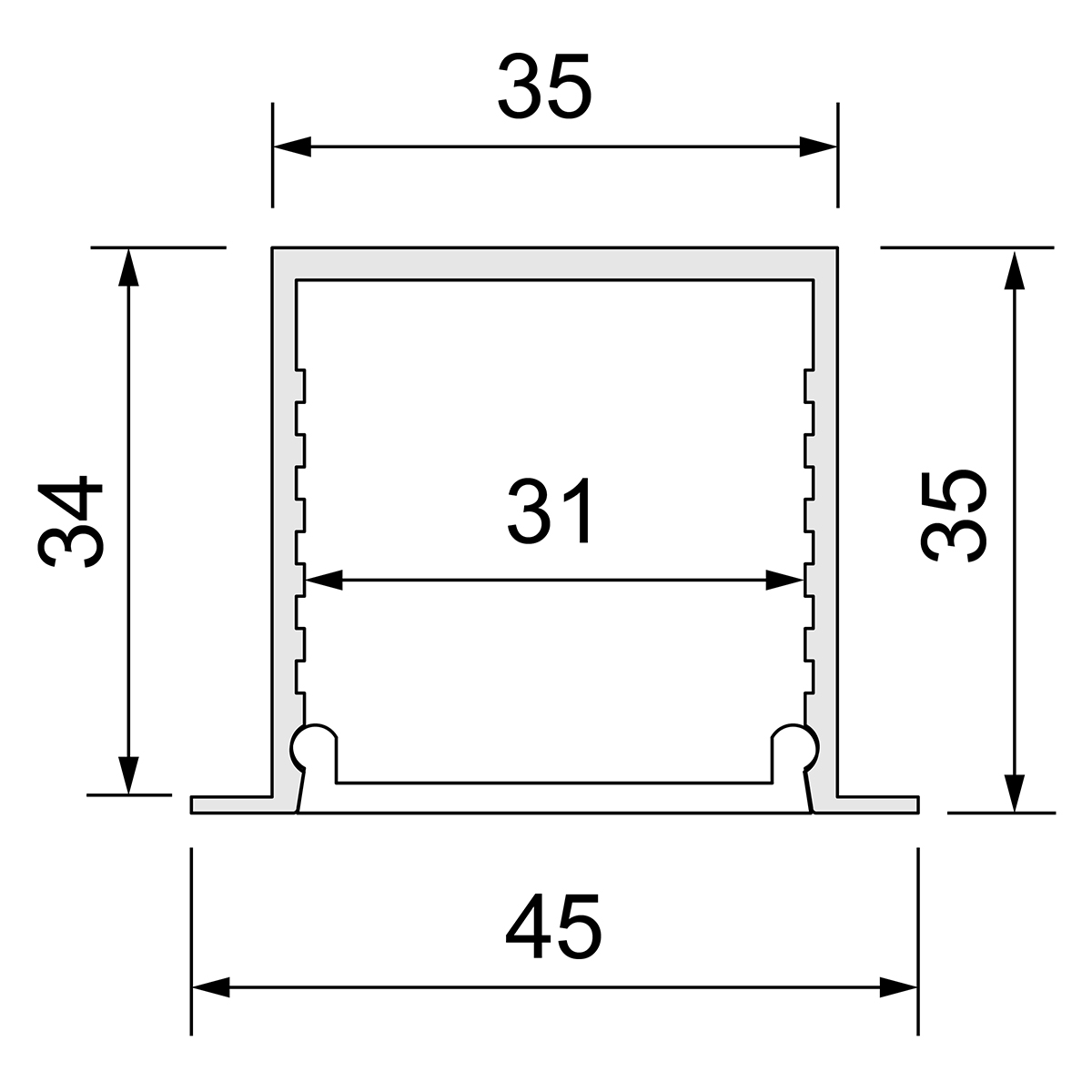 Produktgruppe: U-Profil mit Kragen, Basic 35, Farbe/Finish: eloxiert, Material: Aluminium, Länge: 4003 mm, Breite: 45 mm, Höhe: 35 mm